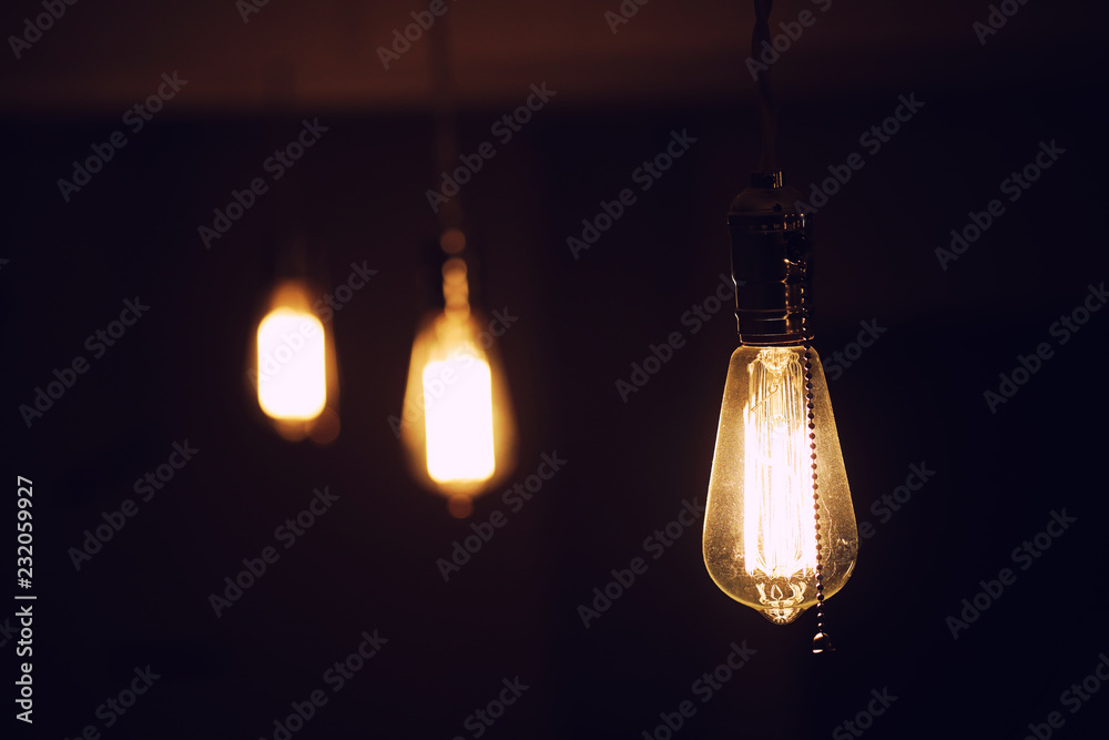 Lamps with tungsten filament. Edison's light bulb. Filament filament in vintage lamps. Retro design of light bulbs.