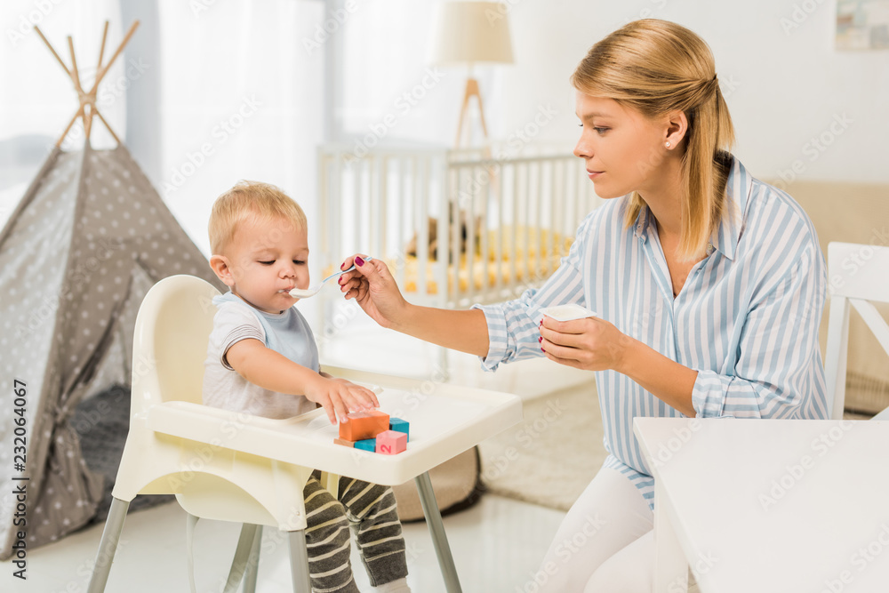 mother feeding son in highchair with baby food in nursery room