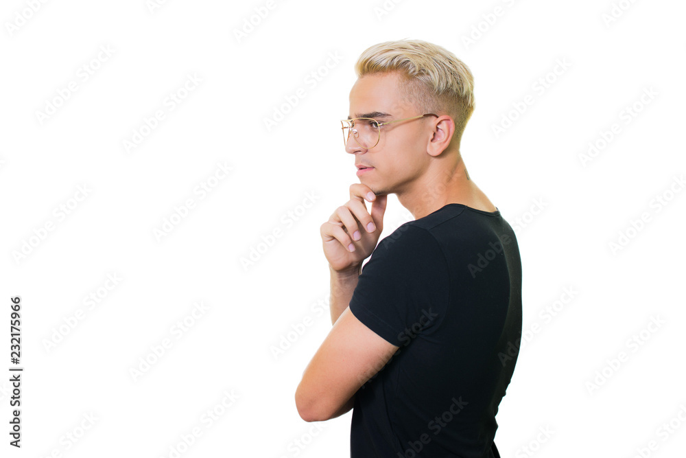 Cheerful guy in glasses posing in studio isolated on white background. thought