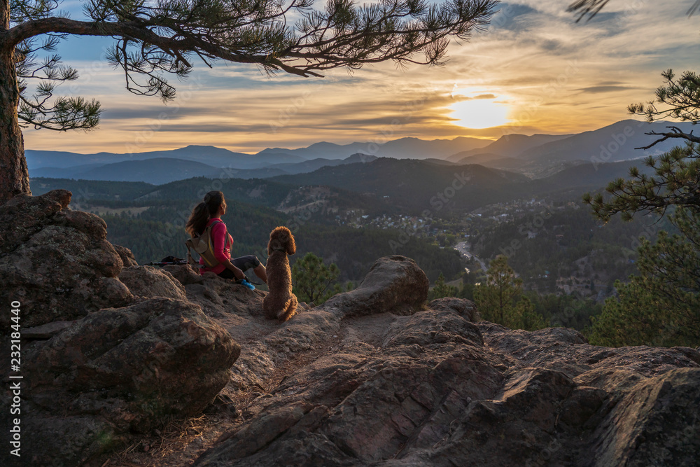 A hispanic woman is hiking with a dog, at sunset, in the Rocky Mountains near Denver, Colorado, USA
