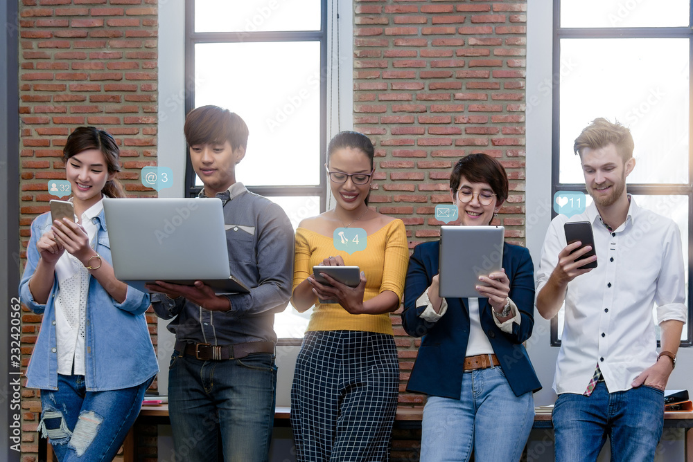 Multiethnic asian business group in casual suit using smart phone, tablet and laptop for working or playing social network and web site in modern office. Business and Technology concept