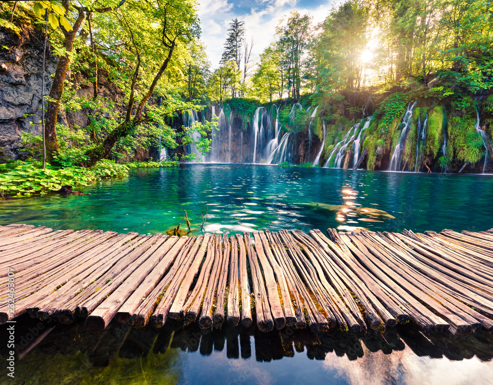 Picturesque morning view of Plitvice National Park. Colorful spring scene of green forest with pure water waterfall. Great countryside landscape of Croatia, Europe.