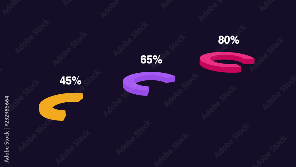 3D infographics. Alpha channel. 3 Pie chart with different numbers percents. Business growth. Used for corporate business reports or presentations. 45 , 65 , 80