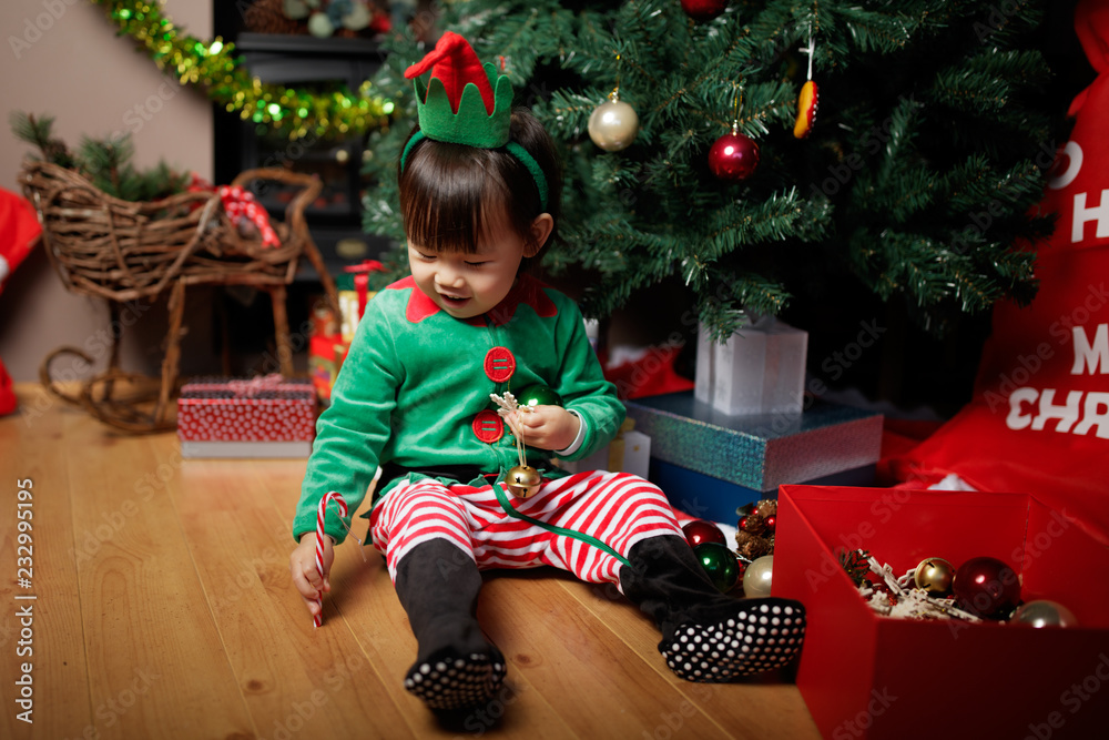 toddler baby girl dressing up and helping decorating Christmas tree