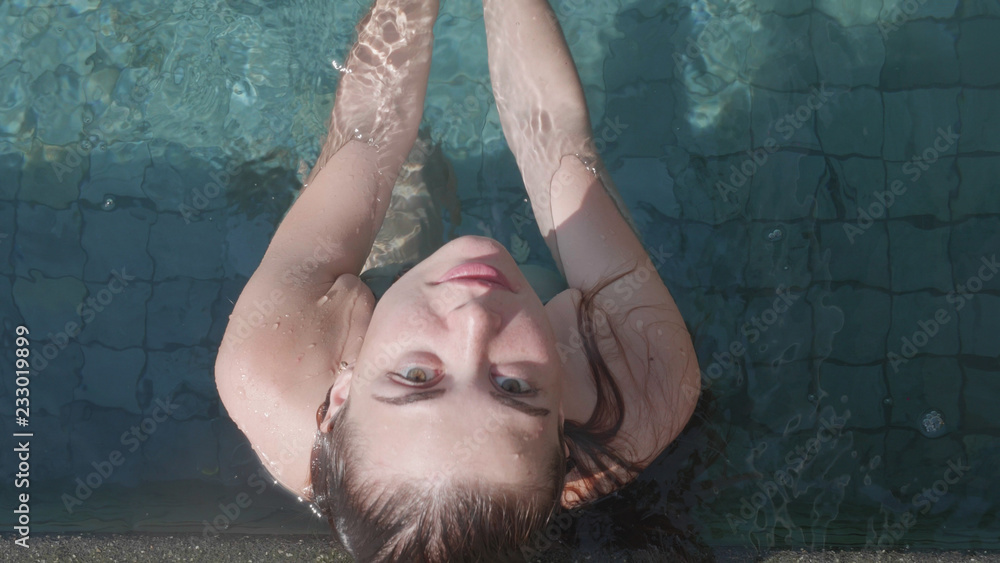 Top view of young pretty woman looking into the camera while relaxing in outdoor pool