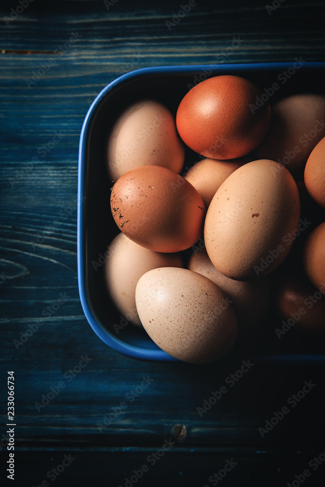 Top view of colorful organic chicken eggs inside blue ceramic bowl,on top of blue wooden background.