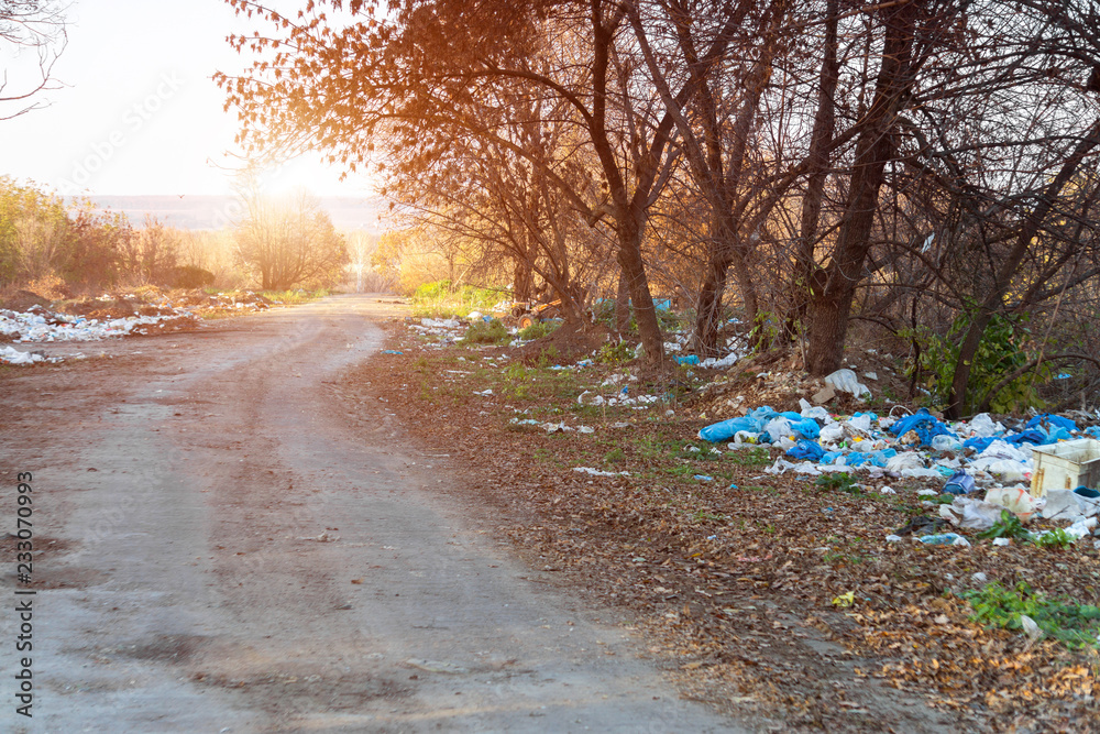 A lot of garbage lying near the road, mountains of garbage, the ecology of the planet