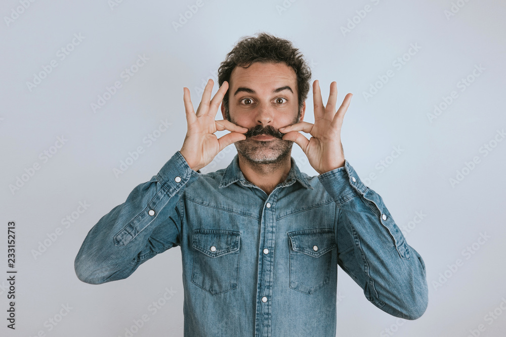 Funny portrait of brown, smiling, handsome man touching his mustache. Jeans shirt. Gray background.