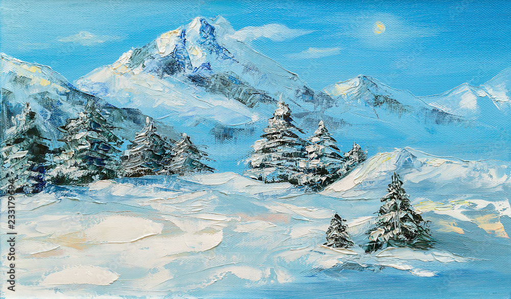 Original oil painting, winter mountain landscape with spruce