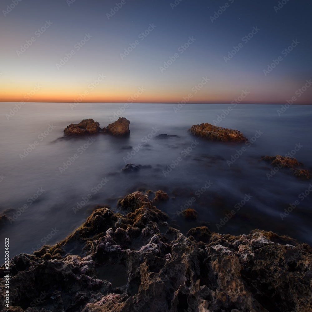 beautiful sunrise at sea shore and wet rocks in water. soft light, pink sky. Square landscape