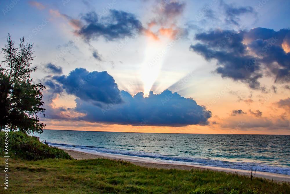 Sunrise behind thick clouds at Bellows Beach, Oahu, Hawaii