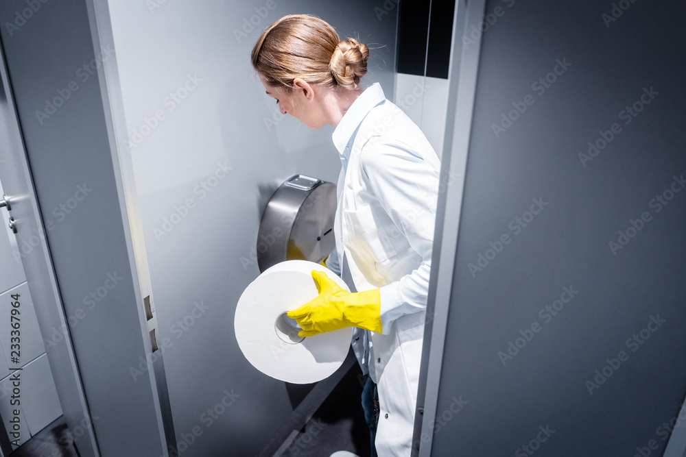 Klofrau oder Raumpflegerin wechselt Klopapier in Toilette