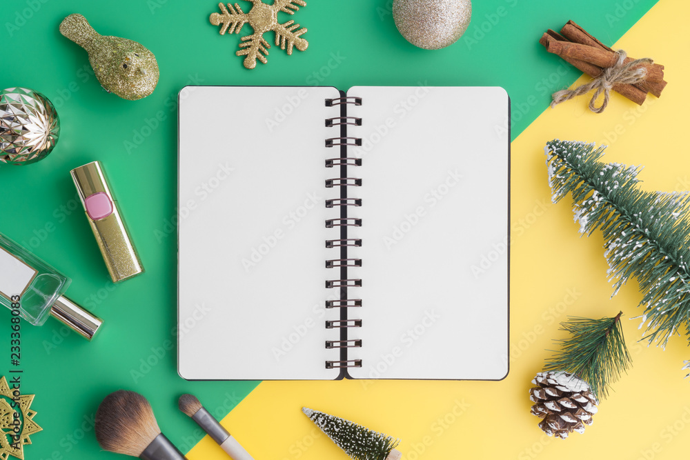 Creative flat lay of craft and blank notebook mock up with christmas ornaments and make up beauty items on green and yellow background, Top view with blank space open notebook.