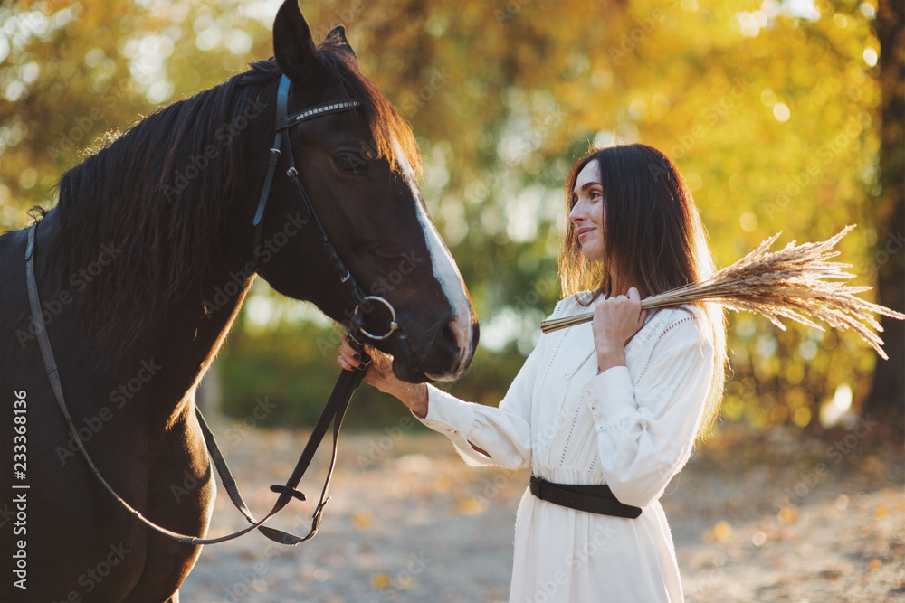Beautiful smiling woman holding horse by the reins in autumn park