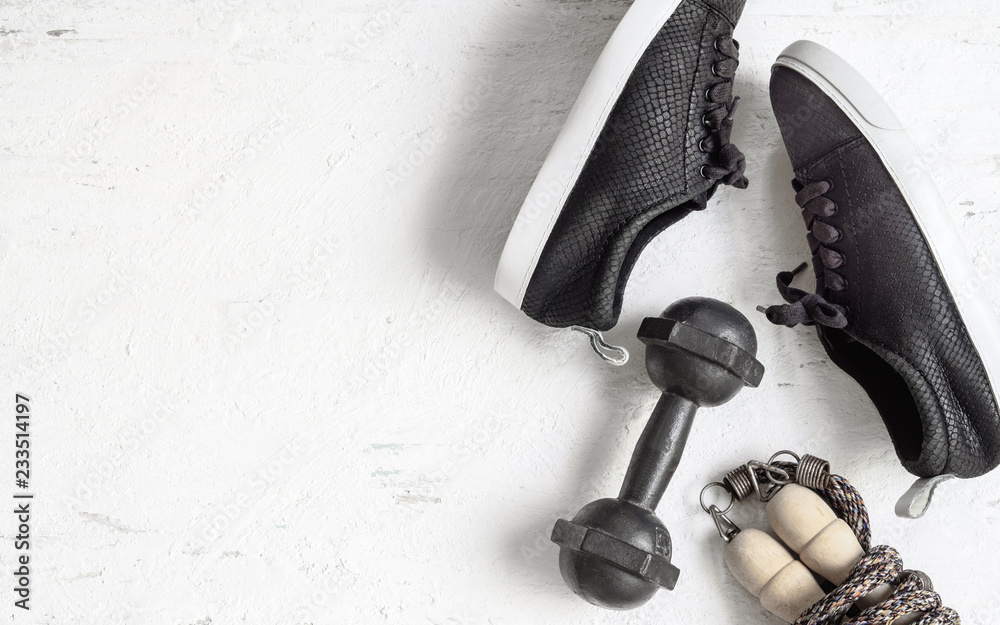 Pair of black sneakers shoe, jump rope and black dumbbell on grunge white wood background. Top view with copy space.