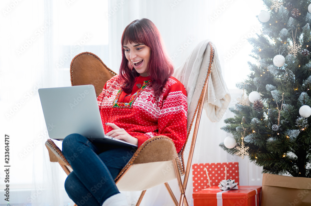 Young woman using laptop next to xmas tree, Christmas shopping online