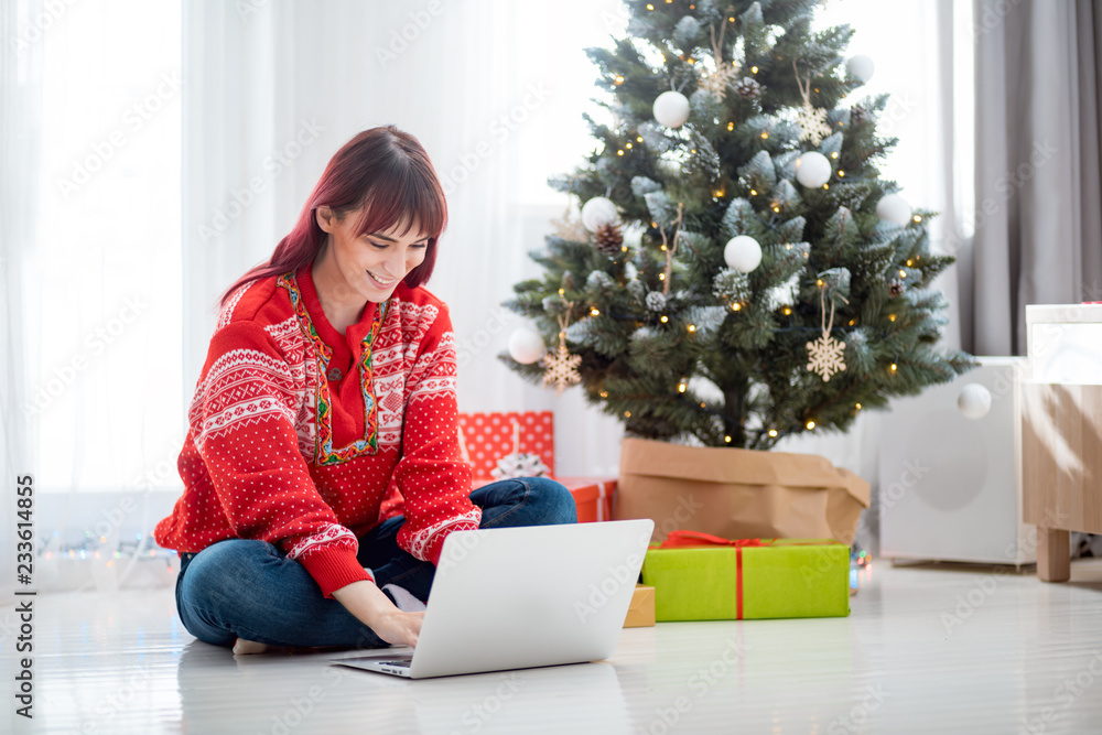 Young woman using laptop next to xmas tree, Christmas shopping online