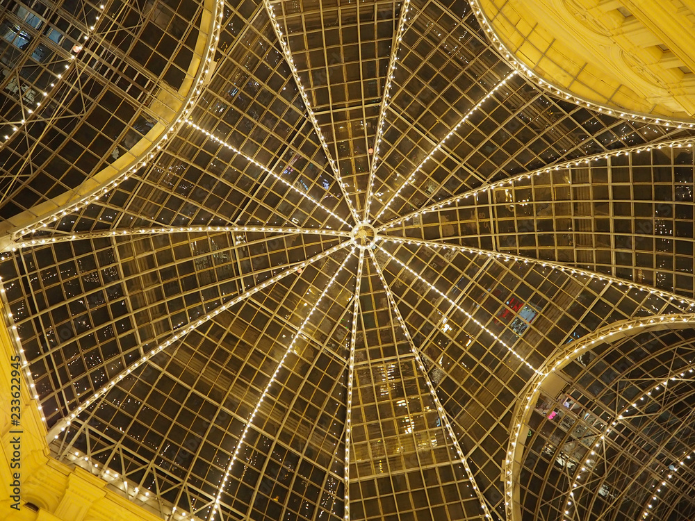 Moscow, Russia - November 2018: Glass ceiling of Main Department store GUM in the Kitay-gorod in Moscow. Russia. Background of metall and glass