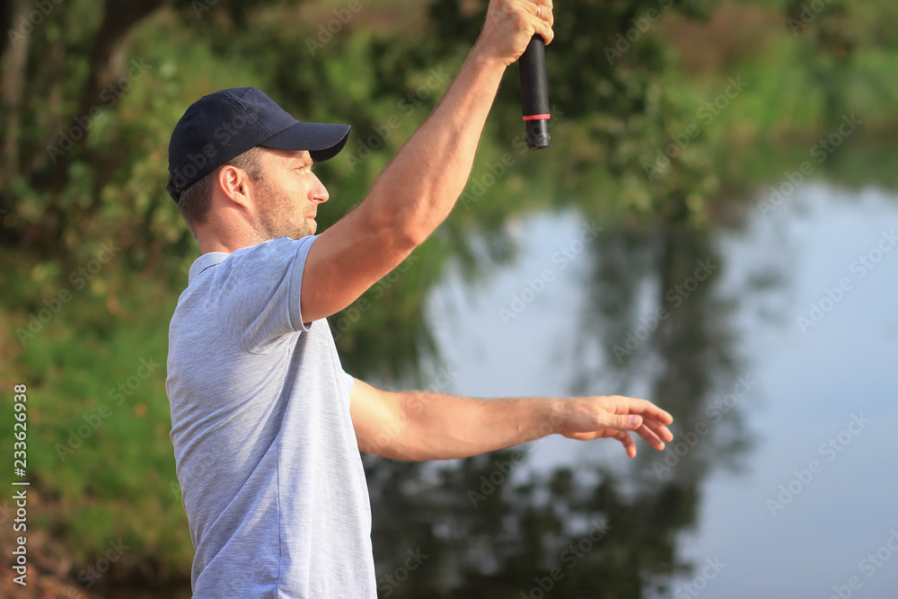Fisherman throwing fishing line into water on lake. Man holds fishing rod.
