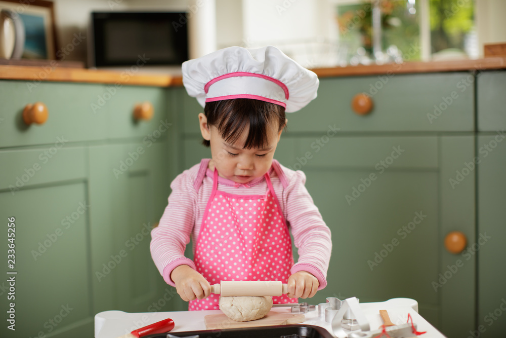 toddler baby girl pretend play baking bread