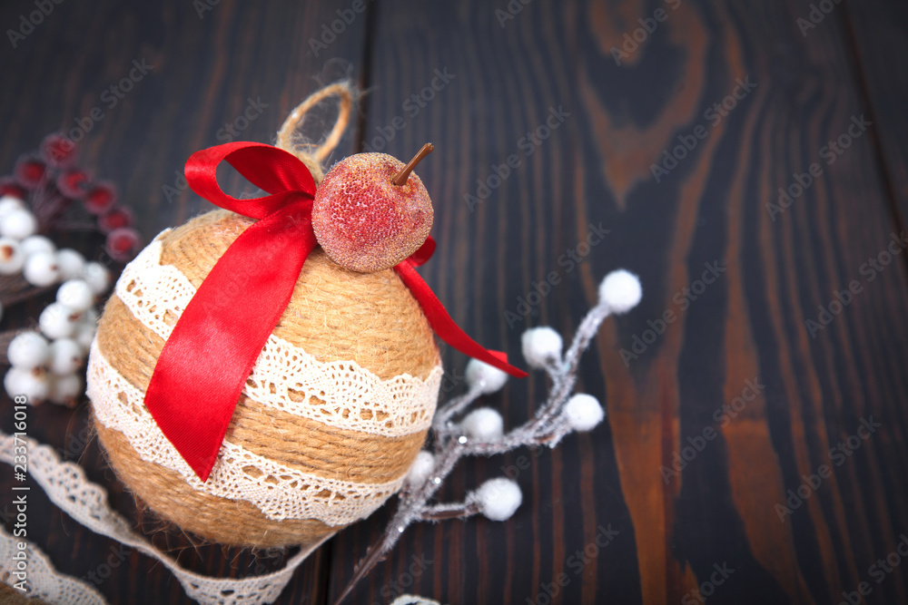 Christmas decoration. Copy space. Christmas tree toy on a wooden background.