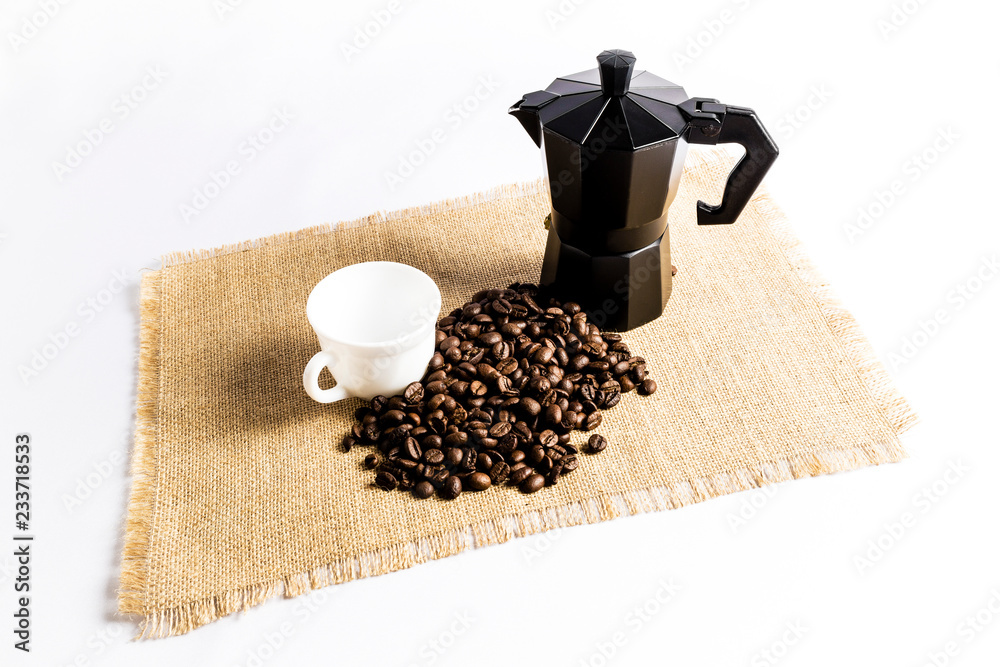 coffee beans next to an Italian coffee maker and a cup on a cloth tablecloth