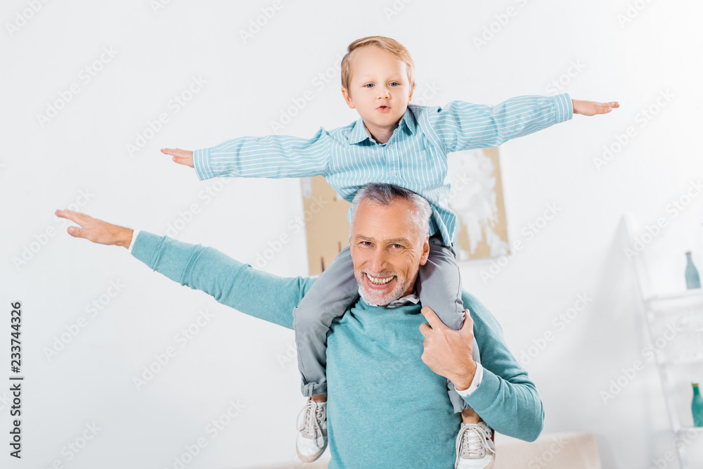 child sitting on happy grandfather shoulders and imitating plane at home
