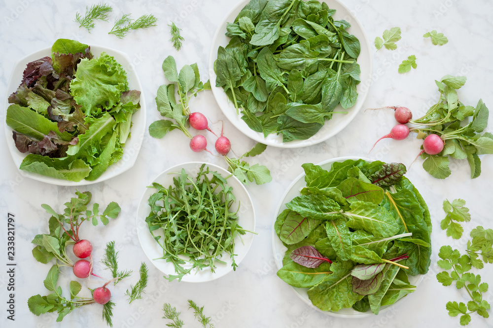 Fresh mixed greens, spinach, chard and arugula with radishes, cilantro and dill.