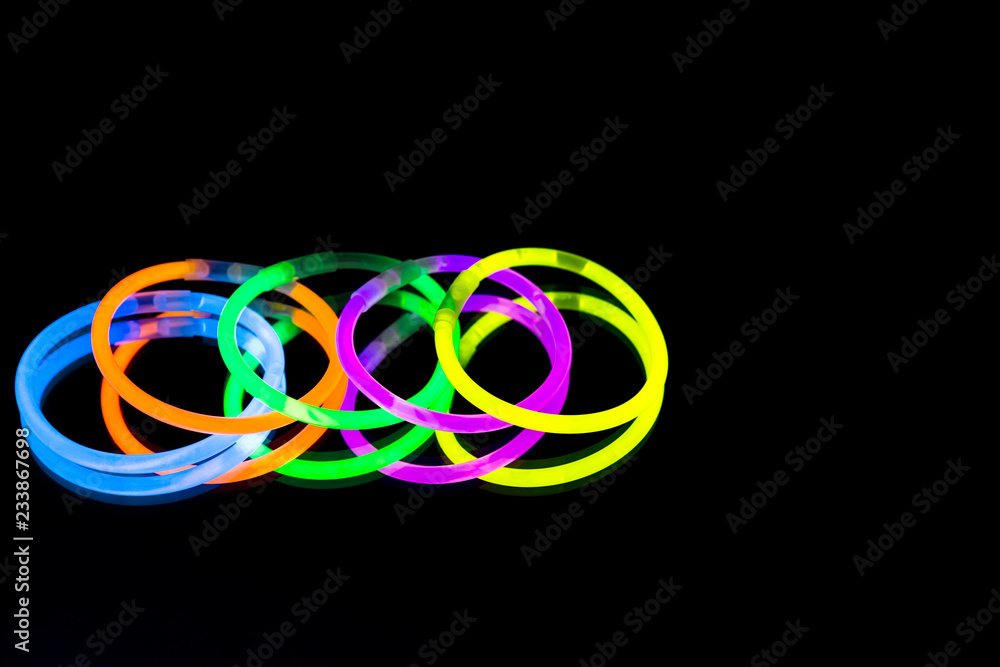 Colorful fluorescent light neon glow stick bracelet strap wristband on mirror reflection black background