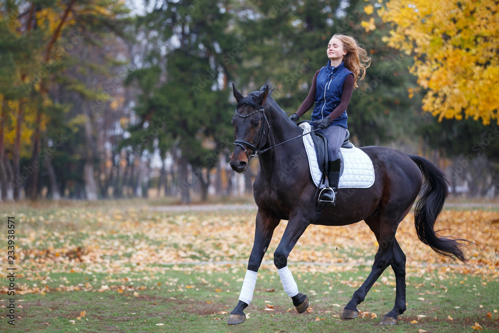 Young rider girl galloping on bay stallion in park