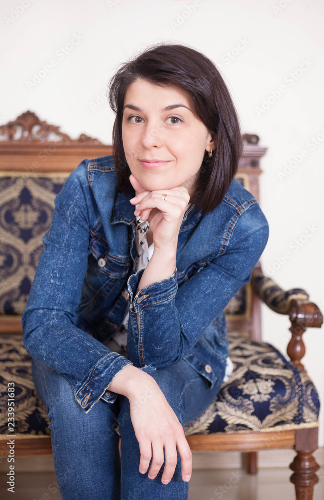 Portrait of a young woman in the interior. Emotions of thoughtfulness and seriousness
