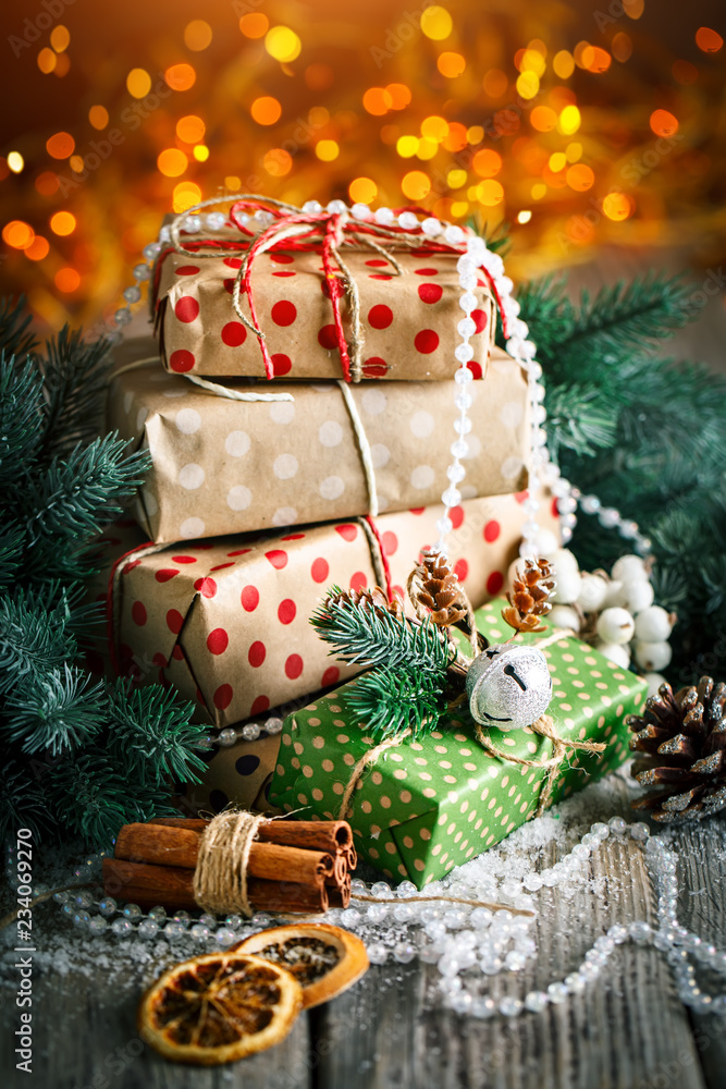 Merry Christmas and happy New year. Christmas gift and Christmas tree on dark wooden background. Selective focus.