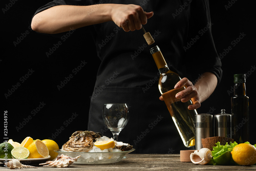 Chef opens Italian dry wine with oysters with lemon, on a dark background