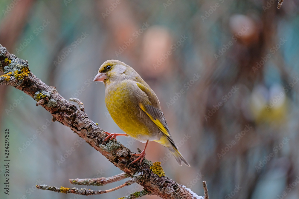 Male European greenfinch (Chloris chloris) isolated in the forest
