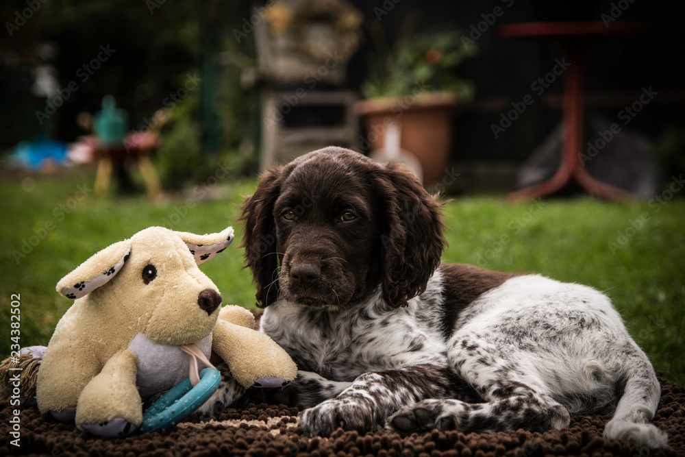 Kleiner Münsterländer mit Kuscheltier