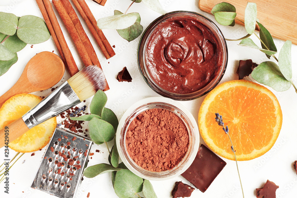 Ingredients for organic plantbased homemade skin care mask. Chocolate, orange,herbs, beauty benefits. Viewed above cosmetic mix home spa.