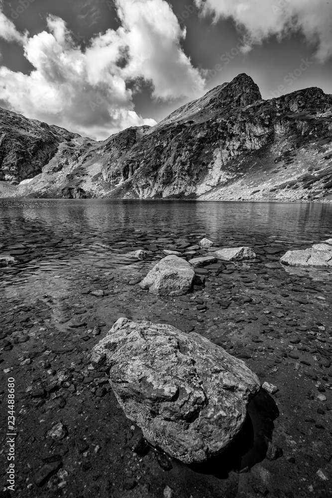 beauty black and white landscape on the mountain lake with a big rock at the front