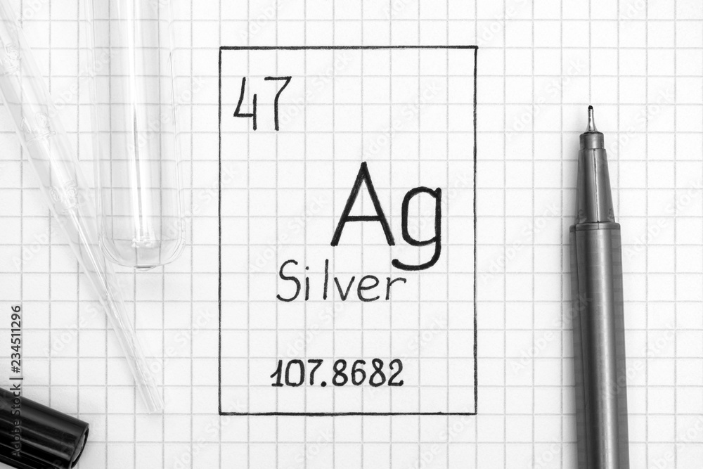 Handwriting chemical element Silver Ag with black pen, test tube and pipette.