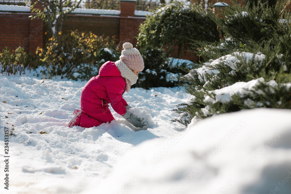 Seven-year cute girl in winter clothes playing with snow in the backyard of a house on a winter sunny day.