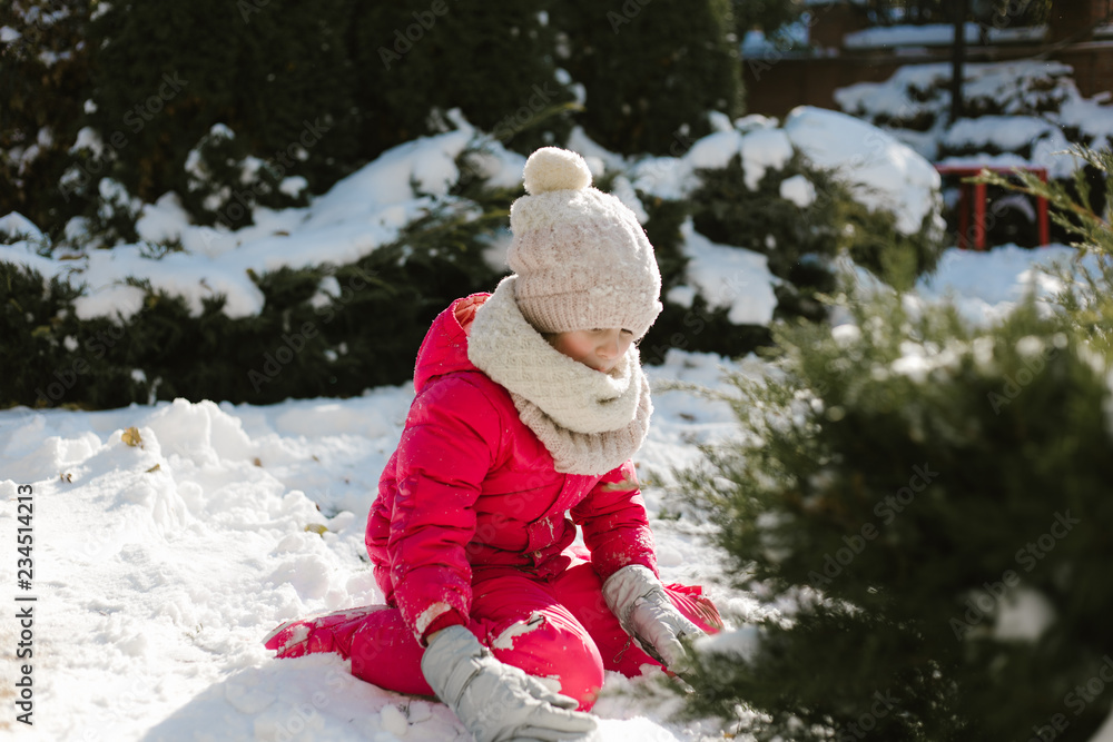 Seven-year cute girl in winter clothes playing with snow in the backyard of a house on a winter sunny day.
