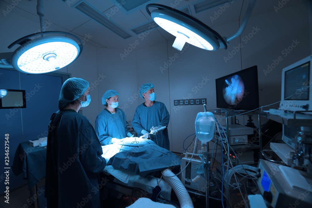 group of veterinarian surgery in operation room for laparoscopic take with art lighting and blue filter