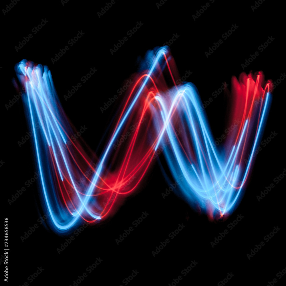 Letter W of the alphabet made from neon sign. The blue light image, long exposure with colored fairy lights, against a black background
