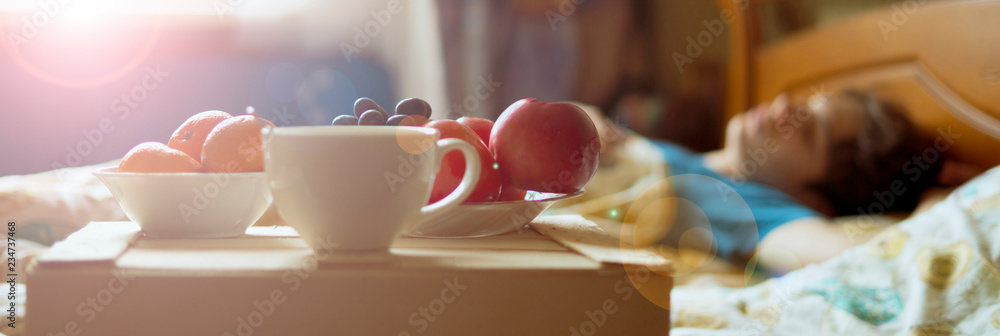 morning breakfast food on the wooden tray in the hotel bed next to the sleeping person f