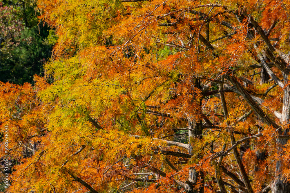Red autumn leaves of cypress Taxodium distichum on the lake in Sukko near the city of Anapa. Once a year the lake becomes magical. Nature concept for design