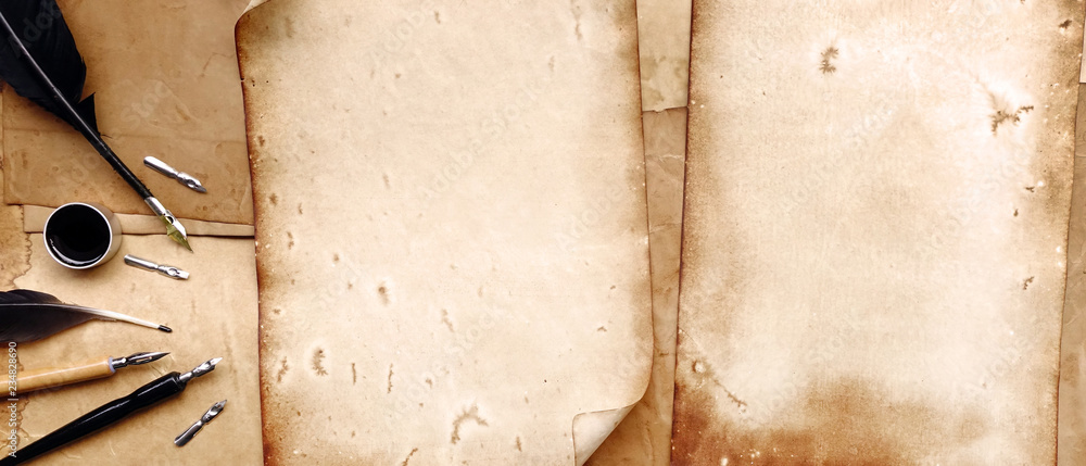 Vintage writing set with old paper on brown wood texture with feather and ink