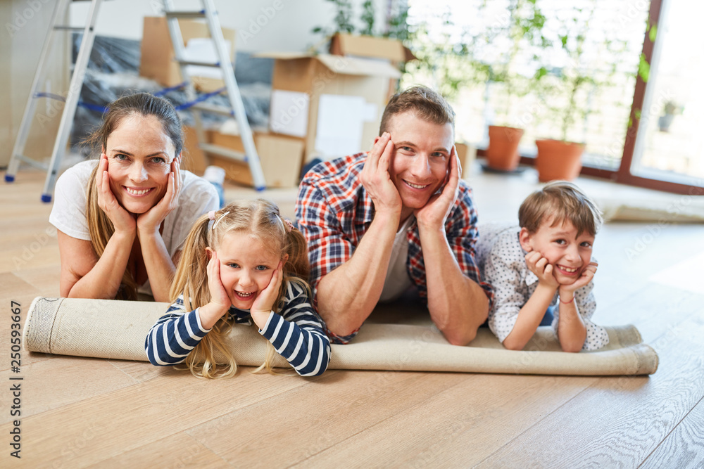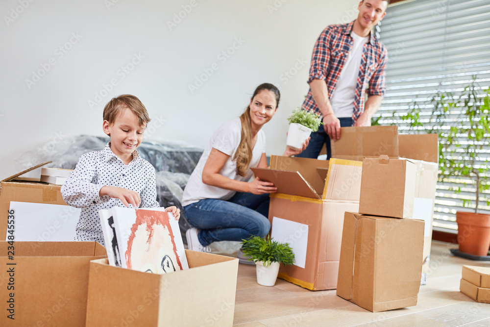 Familie packt Umzugskartons aus beim Umzug