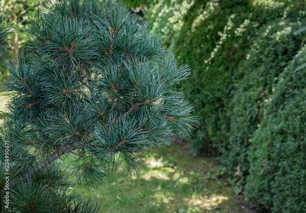 Close-up of original two-tone pine needles of Japanese pine Pinus parviflora Glauca in focus, and little blur green leaves boxwood Buxus sempervirens on background. Nature concept for design.