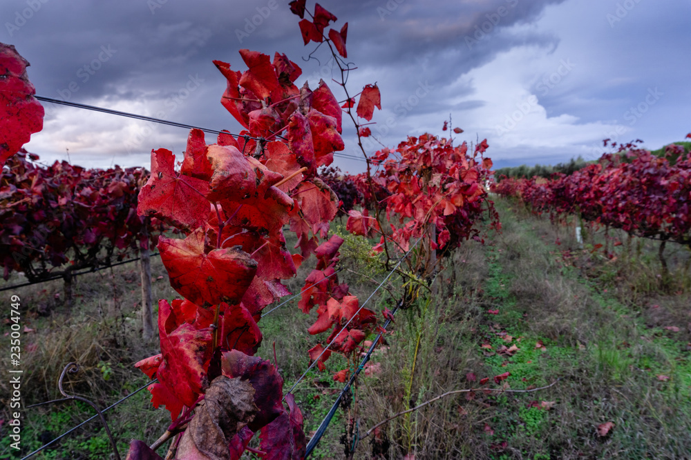 Red rows of vineyards in Ribatejo region during autumn season. Almeirim, Portugal.