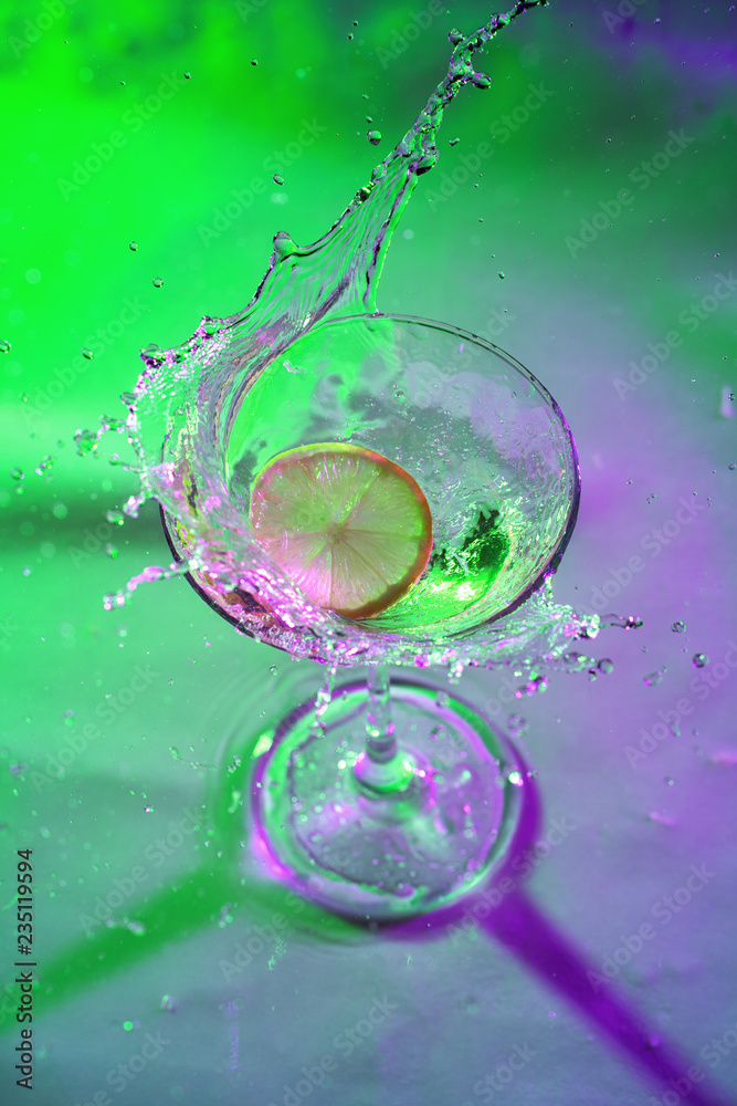 A Margarita Cocktail with a lemon slice on the glass seen on a colored background