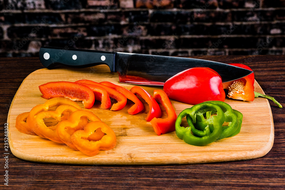 Slicing and chopping colorful Vegetables on a bamboo cutting board with a chef's knife.